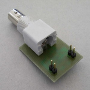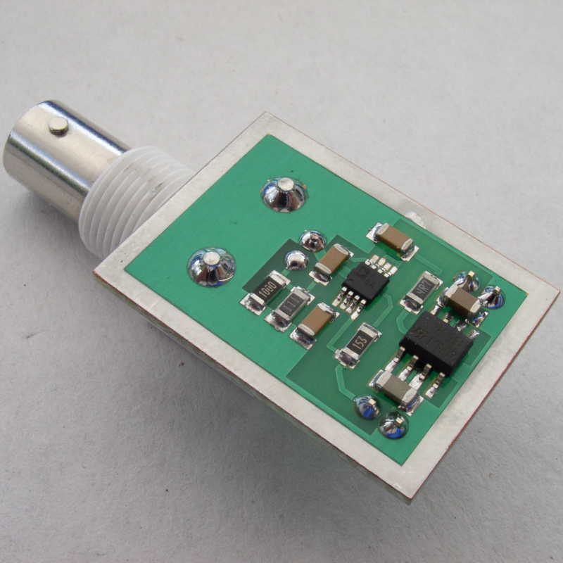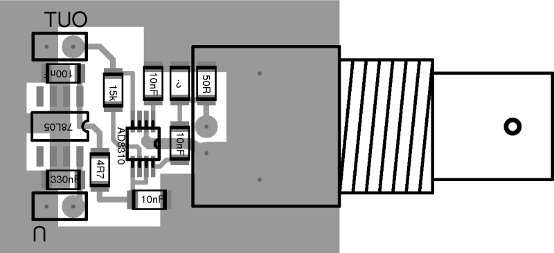 Design is based on described scheme in AD8310 datasheet. Components are in SMD 1206 size, on the top side are BNC connector (from old PC network card) and two 2-pins jumpers for connection of voltage and output (be sure, that the polarities are right connected !).