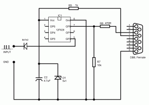 Some years ago I took the decision to begin with RC models. Therefore there was a need to use computer based simulator for learning of control. And because I tried to have similar conditions as in the field, I wanted to use my RC transmitter at home too. One of the most famous free simulator was FMS and for this great software there was possibility to connect RC transmitter with computer with help of PIC from Microchip. But there was only PIC12C508 chip in the design and this type of chip was OTP version only (not nowadays, but in the past). So I modified code and used PIC12F629 / PIC12F675 instead of original one. I simplified scheme too, as You can see at the following picture: