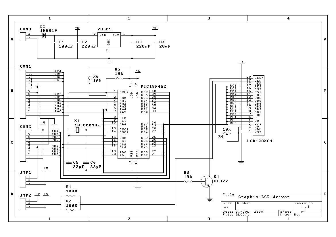 This design describes using PIC18F452 with graphic display (drivers KS0107 and KS0108).