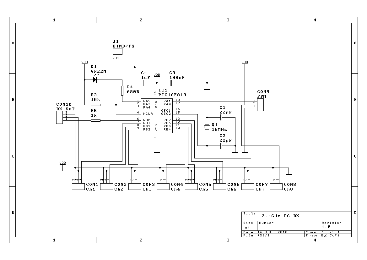 Therefore I tried to find some inspiration on the web and after some period of time finally I found it. My concept was to rebuilt this idea for full featured receiver with at least 7 channels and one PPM output for mikrokopter direct input connection. You can find all the files (scheme, PCB and hex) for manufacturing of this piece of cake below.