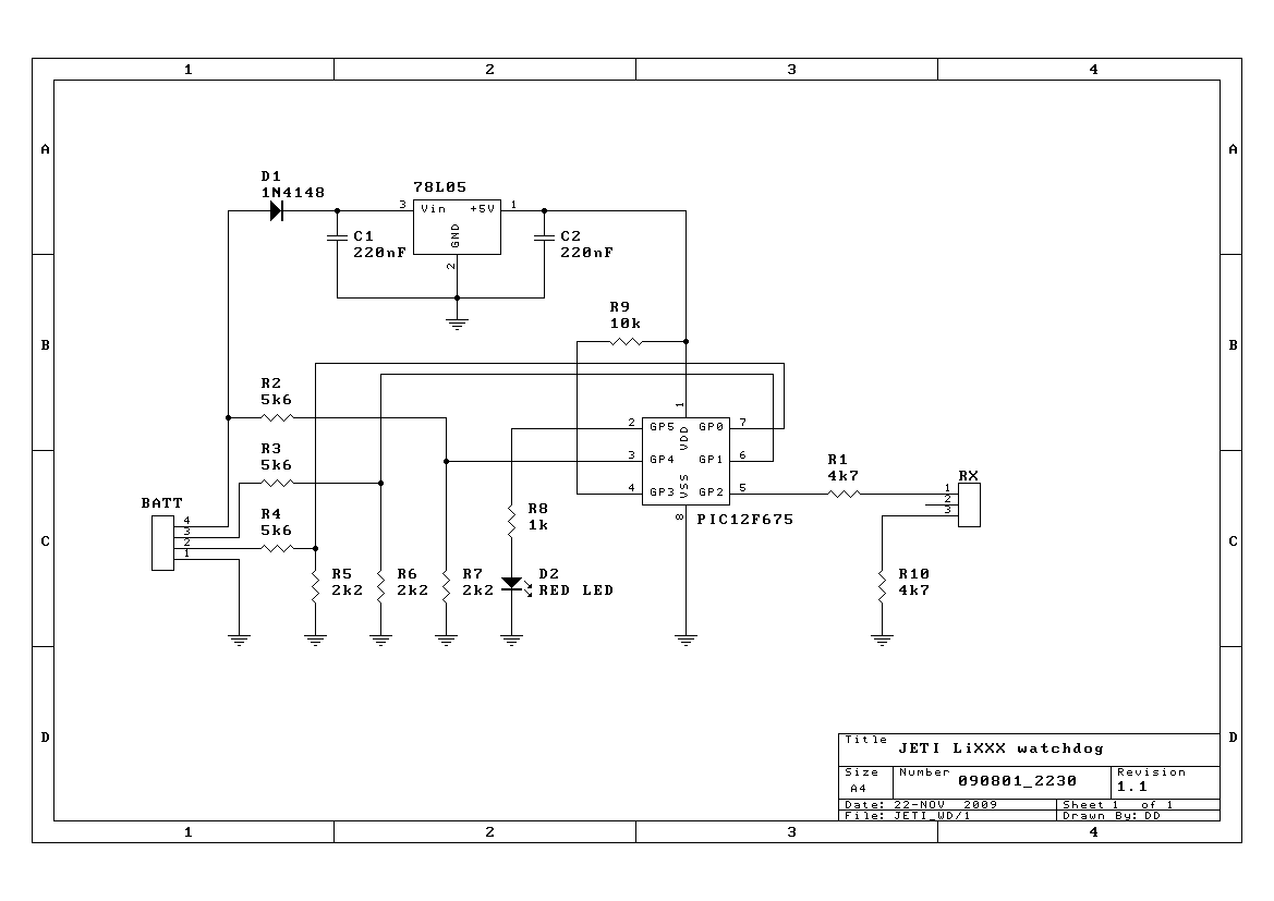 Only two things have changed from previous version of monitor - processor type (it’s cheaper one :-) ) and monitor’s output: there isn’t output transistor already and pin 5 (GP2) from PIC12F675 is connected with data IN/OUT of JETI DUPLEX receiver (EXT. socket) with help of 4.7 kohm resistor. Second wire from the receiver is GND (-), which is connected with this monitor also via the 4.7 kohm resistor (prevents high current in case of unconnected main GND wire …). You can see all the changes at the scheme above.