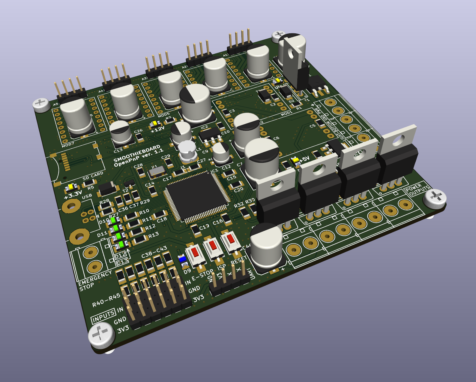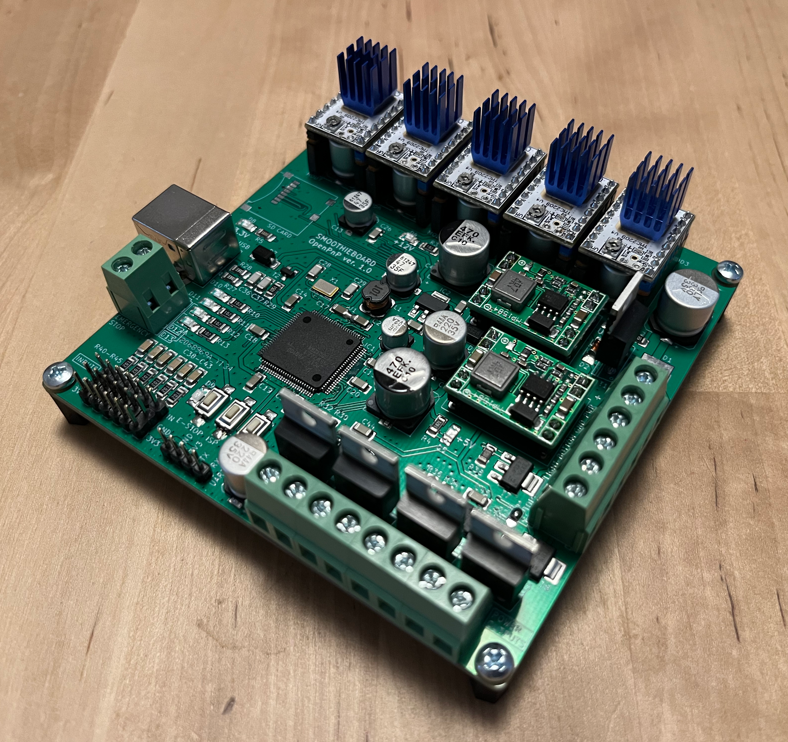The purpose of this design is to offer a solution compatible with the official SmoothieBoard. The idea is to have PCB compatible also with Erich DIY SMT Pick&Place Machine.
