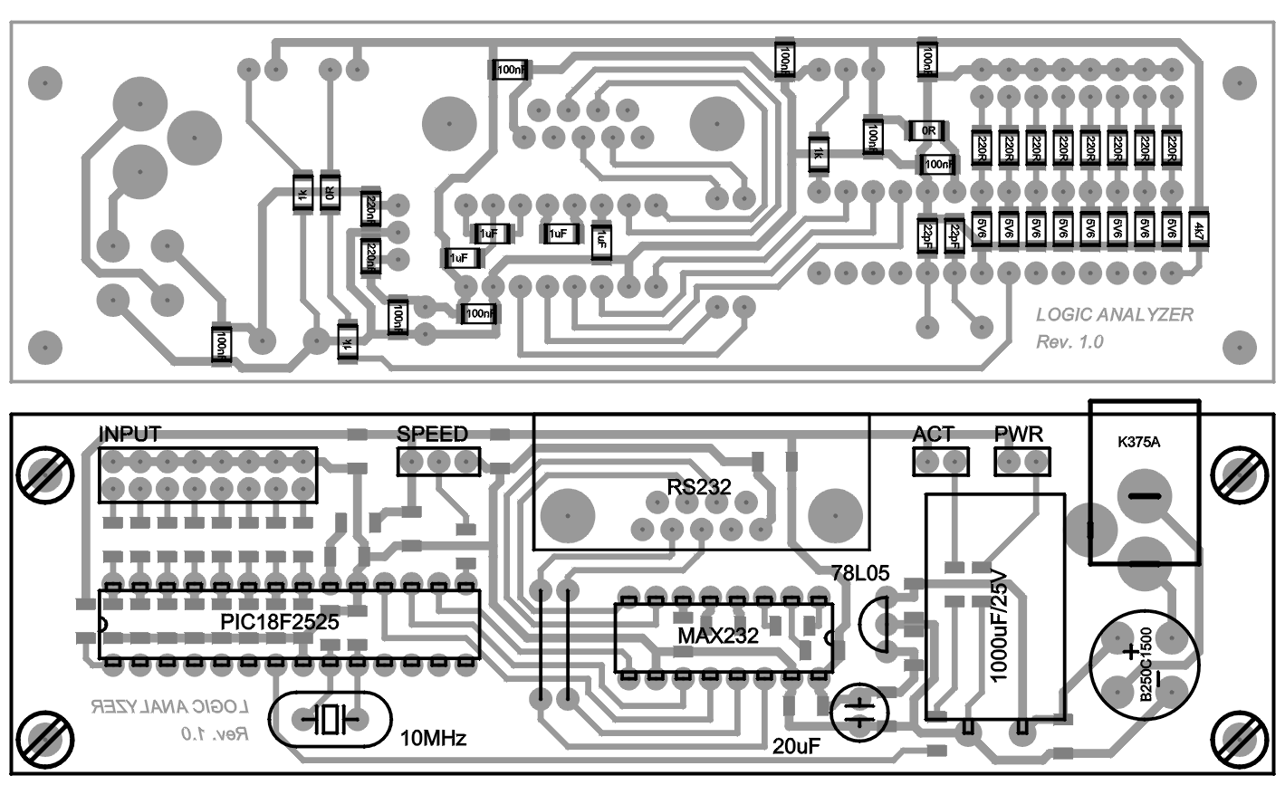 During time, need of simply and portable logic analyzer appears. The idea of interface connected with personal computer seemed to have been very suitable. Then I tried to find out on the web, if such device does exist. Answer is yes – perfect project has been done already. This is PicLA – a very low cost logic analyser. You can find it on the link http://pe1grl.khds.nl/picla/picla.htm , where it’s completely described. Only one thing is missing – PCB. And this is the reason of this post.