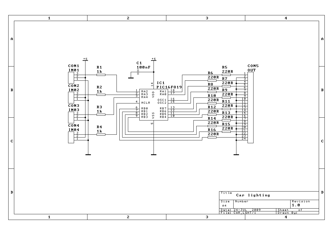 Although I haven’t got any RC car, my friend asked me for programming of RC car lighting system. I produced the code for the PIC16F819 microcontroller from Microchip. Finally, it can have 4 PPM channels as input (I used 3) and 12 outputs (5 of them are used) able to drive max. 25mA per one output (but max. 200mA in total!).