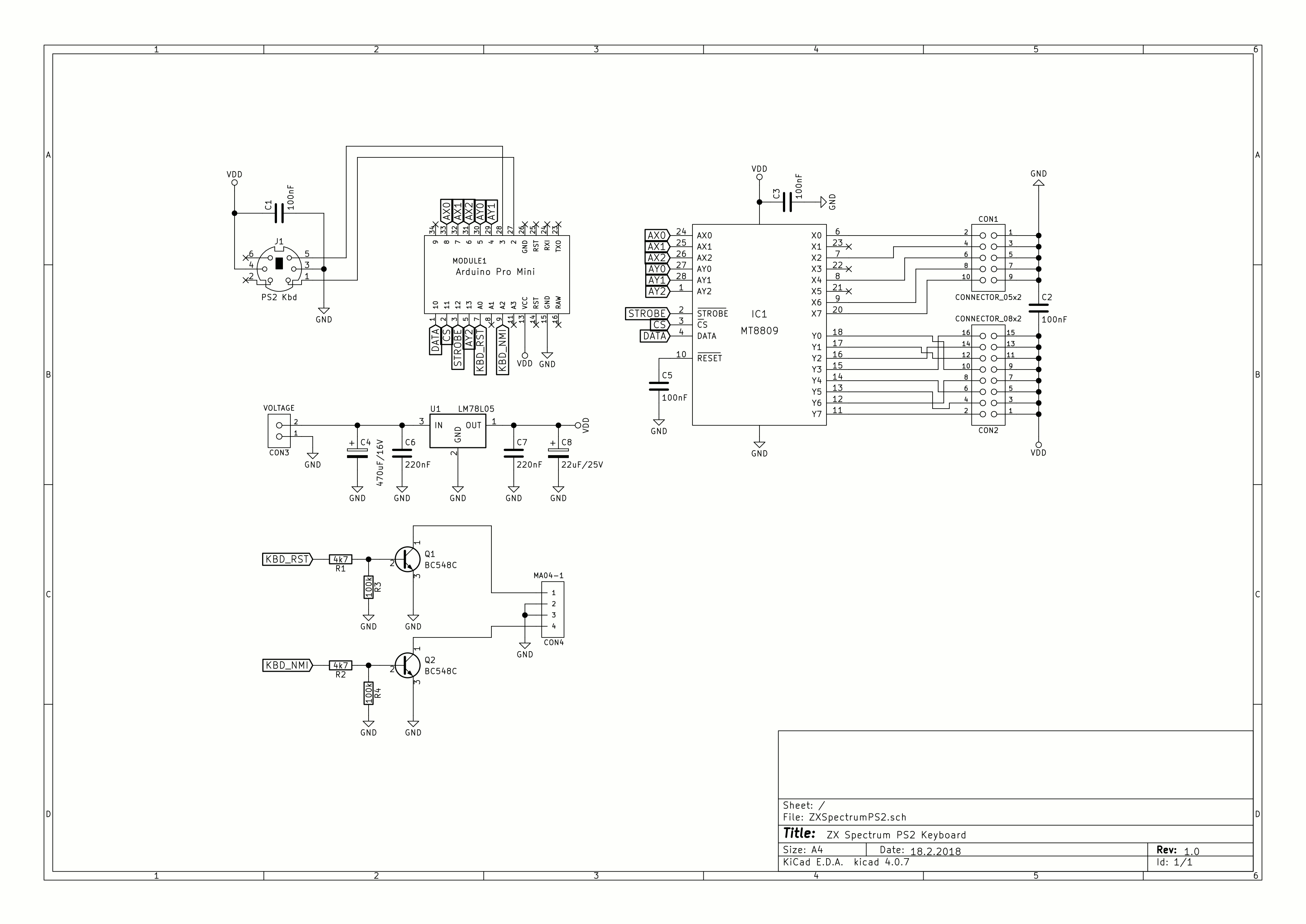 My design of ZX Spectrum PS2 keyboard converter is based on the Arduino Pro mini platform cooperating with 8x8 analog switch array IC MT8809.